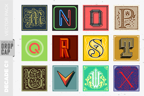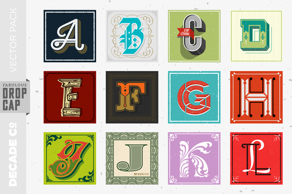 26 high Quality drop cap in vector file (.eps & .ai). Each letter individually grouped and highly detailed/textured, Change the colour to suit your design and use as decorative initials on wedding invitations, letterheads, menus, threatening letters, ransom notes, certificates and heraldic documents.
