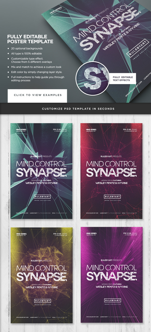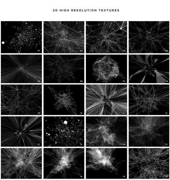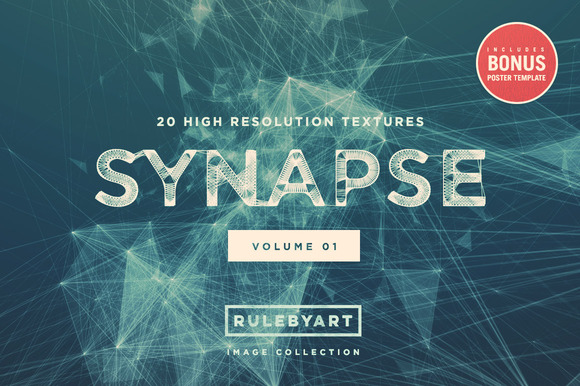 Synapse Vol.1 is a collection of 20 high resolution abstract images reminiscent of a celestial universe and all of its interconnectedness. The visual spiderweb created in these images make for an excellent background or whatever else you have in mind. To get the creative juices flowing I made a poster design using the Synapse Vol.1 imagery. Included in this set is the fully editable PSD for this poster so you can use it as is or play around with it yourself.